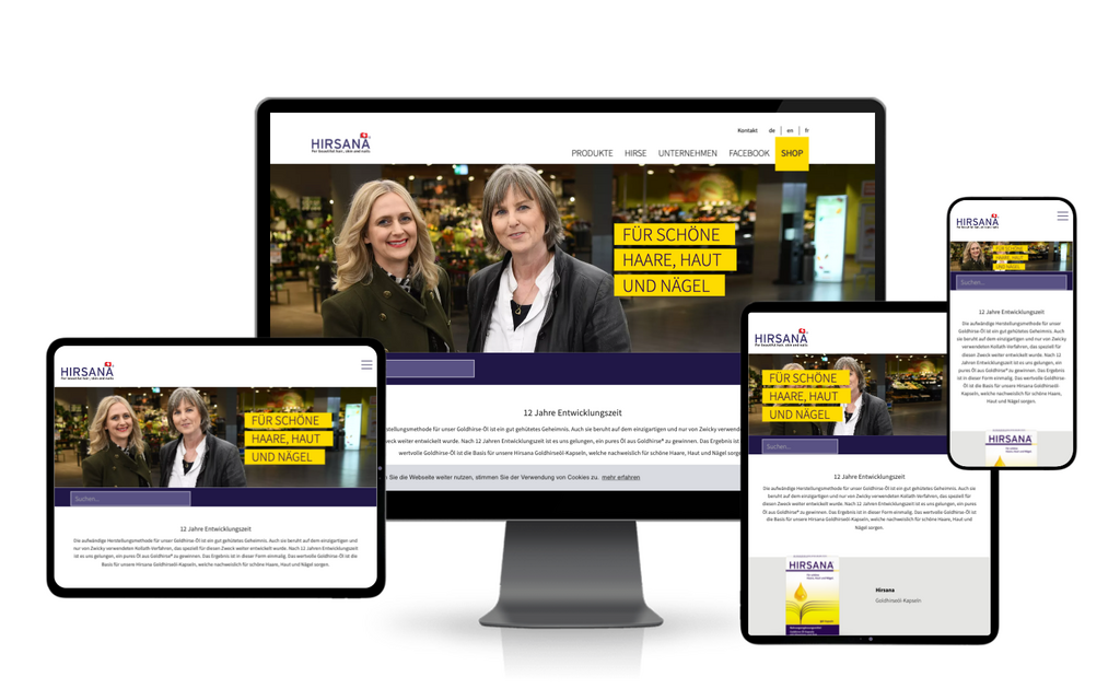 Für die bekannten Hirsana® Goldhirseöl-Kapseln wurde eine moderne, mehrsprachige Webseite realisiert. Ziel war es, das Markenbild online zu stärken, Vertrauen zu schaffen und die Produkte professionell zu präsentieren – abgestimmt auf das Corporate Design und optimiert für alle Endgeräte.